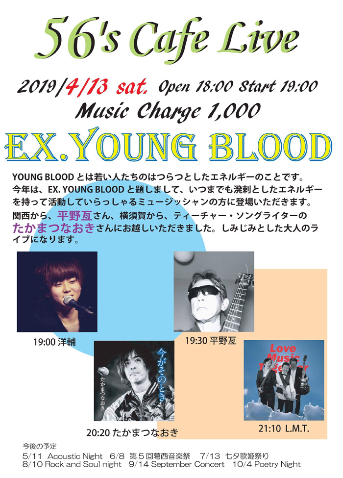 なんとも有難いことに、翌日の【弾き語りまくりvol.1】の実施にあたりほとんど全てのことでお世話になった小田俊明氏主宰のライブの出演にご招待いただいた。 トリの「T.M.L.」さんが小田氏のバンドだ。僕の2番目というのも初東京である私へのご配慮と感謝です。 56's Cafeさんは、本格ライブ・カフェ(バー)のようで音響も良さそう。期待大です。精一杯かましますので、ご都合のつく方は是非。 |