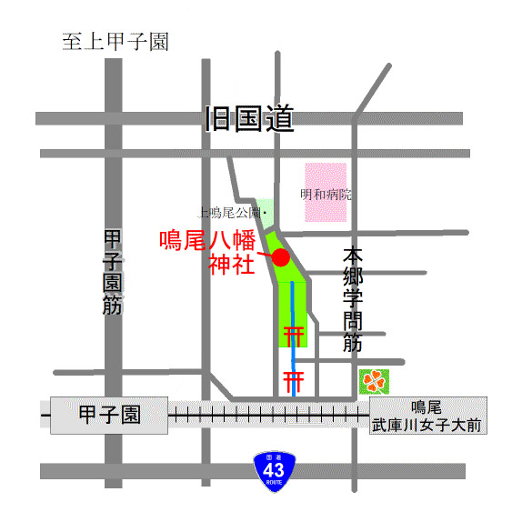 創建は後花園天皇が在位した文安年間と伝えられている。旧称は廣幡八幡宮。 文明年間には鳴尾村を含む7村の総鎮守となり、本郷の宮と称された。 また有栖川宮家より代々に渡り崇敬され、度々幣帛と御歌が寄進されている。 さらに1906年(明治39年)に公布された神社合祀令により、武庫郡鳴尾村の村社・総鎮守として、翌年から1912年(大正元年)にかけて砂浜神社など鳴尾村内の数社を合祀した。 |